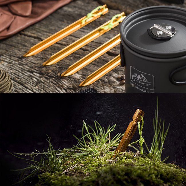 Tarp Stakes are a set of four lightweight aluminum tarp pegs. Due to the material, they are made of, they are 100% resistant to rust. A special profile increases their durability and enhances stability when theyre driven into the ground. Each stake weighs only 12 grams and has a bright string for easy pulling from the ground. The strings also allow you to connect stakes with each other, so you will avoid losing them during the trip.