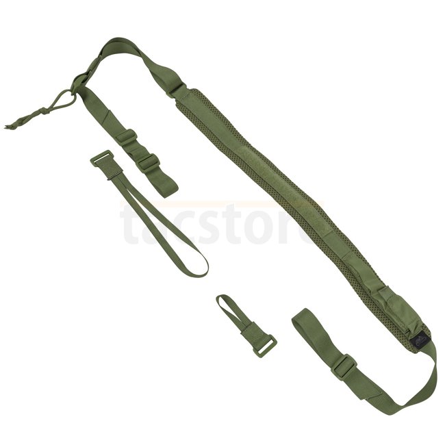 Helikon-Tex Two Point Carbine Sling - Olive Green. Made of durable nylon webbing with padded comfort pad and Velcro closed battery pocket. Features loop velcro stripe for personalization and quick adjustment system. Great for mounting to the weapon with w