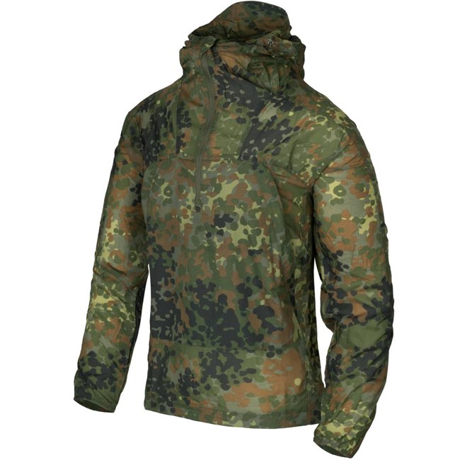 Helikon-Tex Windrunner Windshirt in Flecktarn color and size 3XL. Ultralight and compact, made of tight-woven Nylon fabric with DWR coating for wind and light rain protection. Ideal for jogging with armpit ventilation slats for air circulation. Features a