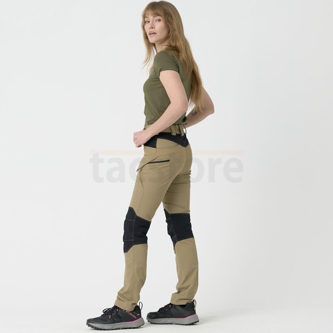 Helikon-Tex Women's OTP Outdoor Tactical Pants - Khaki / Black - M - Long. VersaStretch® fabric for breathability, 4-way stretch, ergonomic cut. DWR coated, reinforced knees with protective pads pockets. 8 total pockets, contoured rear leg part. Main: 93%
