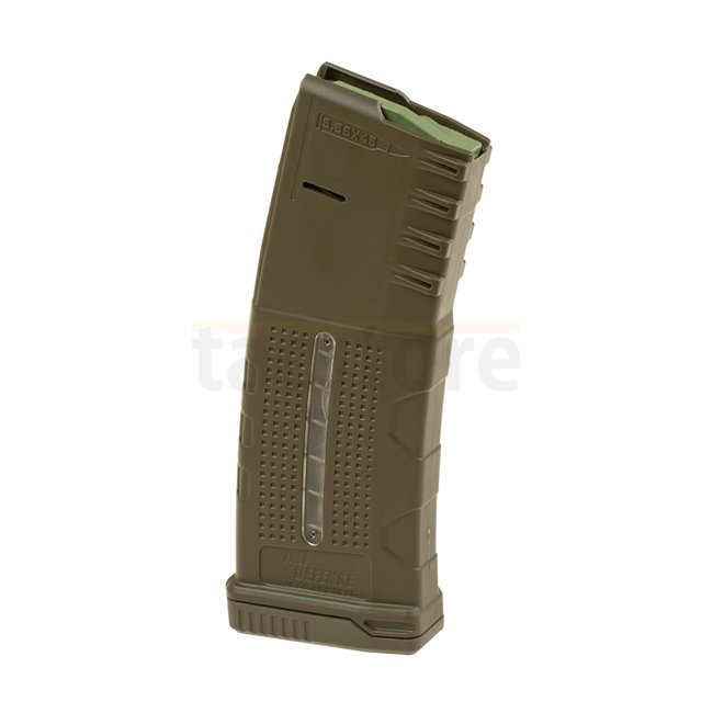 30 round AR-15 magazine in Olive with rubberized floor plate for superior grip. Transparent window for round counting. Suitable for M4, M16, HK416, FN SCAR, and more.