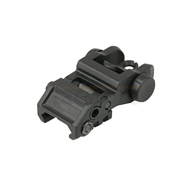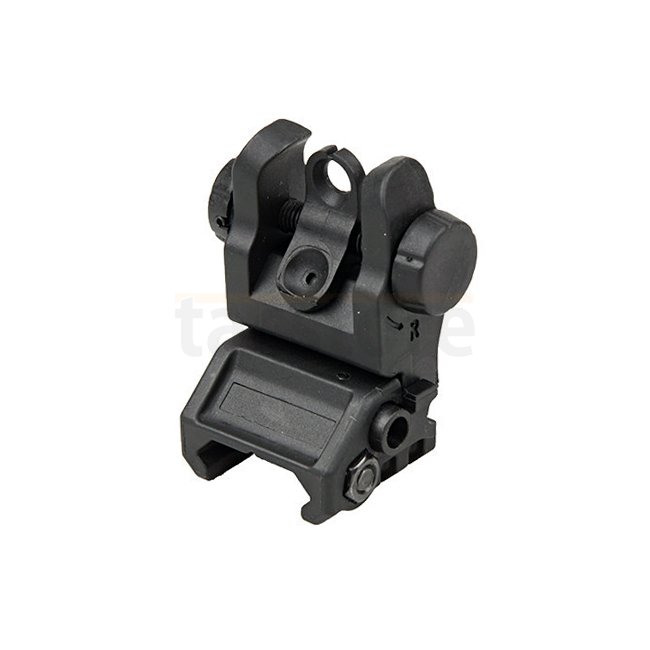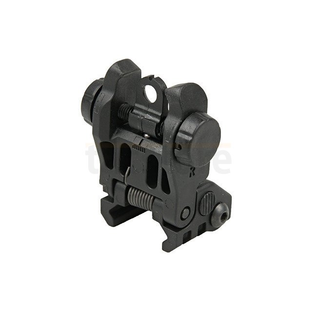 High-quality IMI Defense Rear Polymer Sight in black. Injection molded for durability and tested to meet IMI Defense standards. Compatible with Picatinny railed weapons. Features spring-loaded flip-up system, dual aperture, ambidextrous windage adjustment