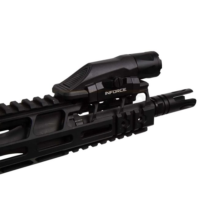 Inforce WML White Gen3 in Dark Earth color, with MIL-STD-1913 mount. Lightweight polymer construction, waterproof up to 20m. Features a 450 Lumens LED output with 10'000 Candela brightness. Includes constant on, momentary on, and strobe modes. Pressure sw