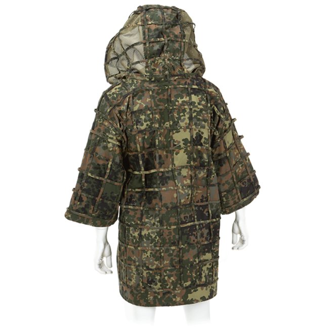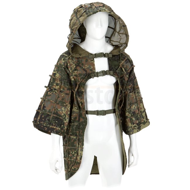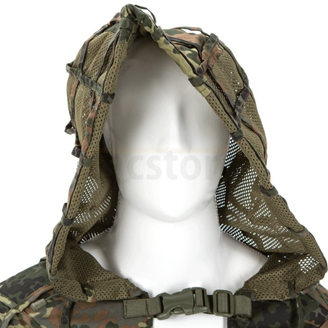 Typically worn over the base layer of the uniform and worn gear, this coverall is constructed of lightweight but durable fabric. The base of the suit is a combination of a bolero-style shell with a cape outfitted with camouflage netting and leaf-shaped pieces of cloth. The adjustable chest buckles and shock cords integrated into the sleeves provide the wearer with a high level of regulation and comfort, while allowing access to gear worn on the chest.