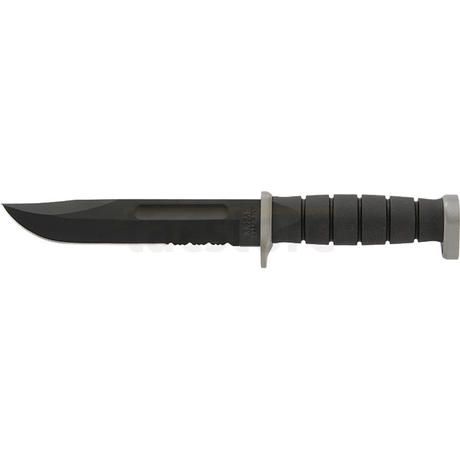 Cutting tests prove that D2 is one of the toughest steels used in knife making. Featured here in the classic clip point blade shape that made KA-BAR famous. A partially serrated edge makes cutting looped and synthetic materials a breeze. Tang stamped USA. MOLLE-compatible hard plastic sheath included. Made in the USA.