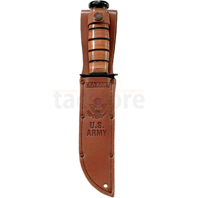 The traditional KA-BAR marked for ARMY personnel and featuring a partially serrated edge to aid in cutting synthetic and looped materials. Tang stamped U.S. ARMY. Leather sheath included. Made in the USA.