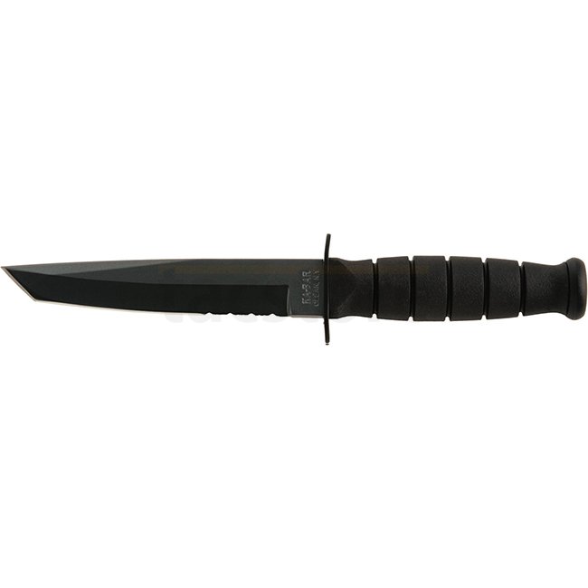 Compact & rugged Ka-Bar Short Tanto with sharp serrated blade & hard plastic sheath. Ideal for tough materials.