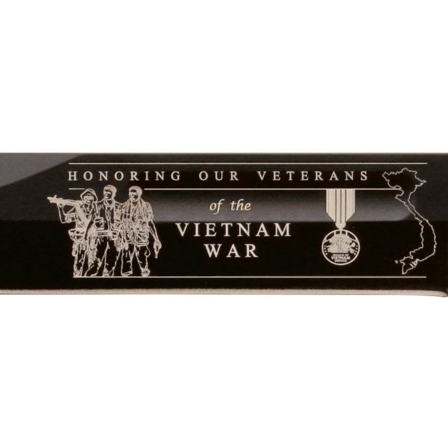 This knife has been laser engraved with carefully designed blade art meant to honor the Veterans of the Vietnam War. Tang stamped U.S. ARMY. Leather sheath included. Made in the USA.