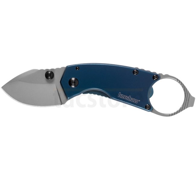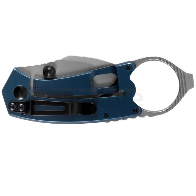 Compact and versatile, the Kershaw Antic Framelock Folder - Blue features an oversized ring for enhanced ergonomics and a multifunctional design. It doubles as a karambit-style grip with a flat head screwdriver, mini prybar, and a cleverly placed bottle o