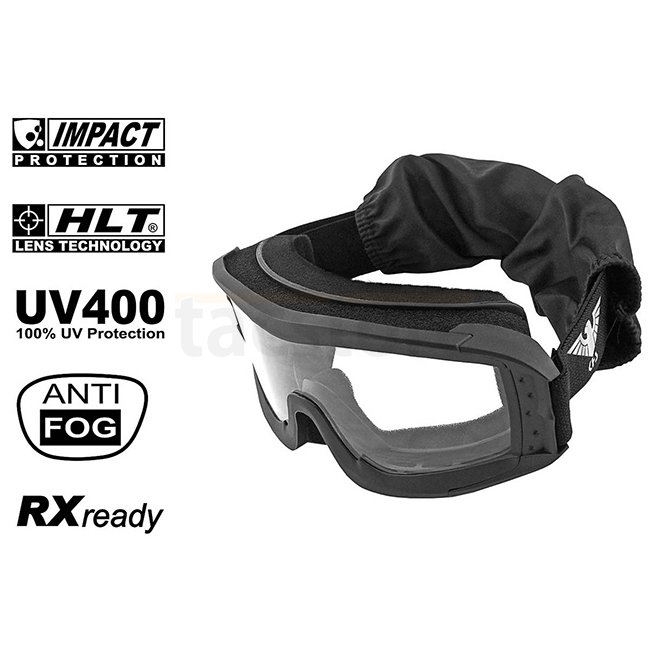 Military Tactical Glasses with Clear Black lenses. Shatter-proof quality for distortion-free vision. Anti-fog coating, UV 400 protection, and filter category 0. Compliant with various military standards. Polycarbonate lenses and Synthetic frame material.