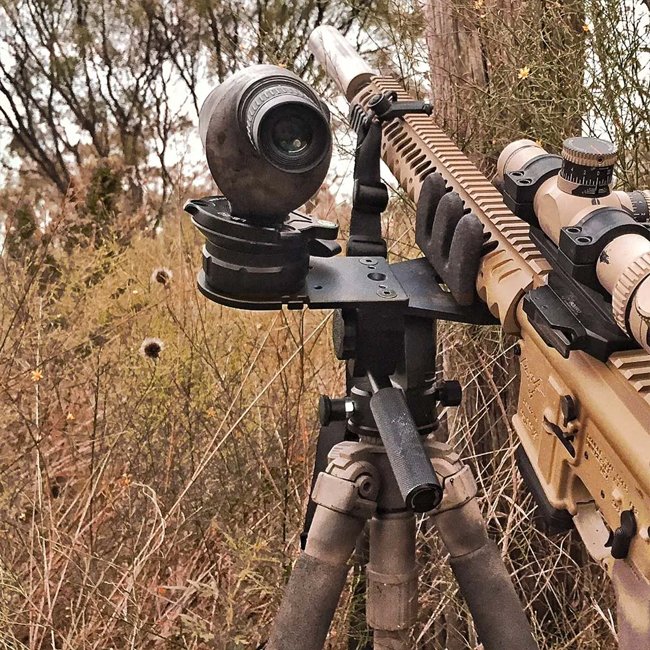 Alignment accessory for camera or spotting scope to rifle height with KJI Leveling Head. Attaches to KJI Reaper Rig Accessory Plate & Reaper Grip System for precise leveling. Features bubble level, compatibility with various devices, QD latch, and durable