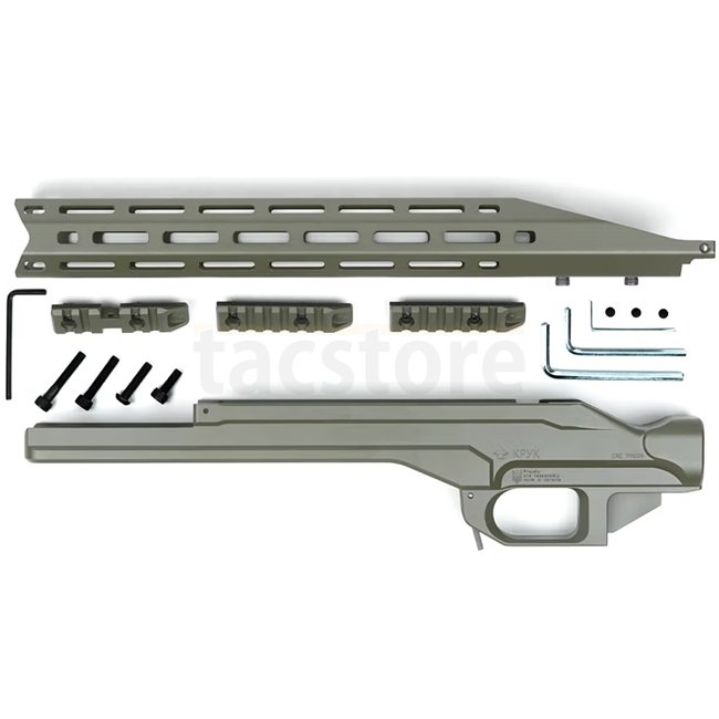 KRUK Aluminum Chassis & Handguard Howa 1500 Short Action - Olive: High-performance chassis system for Howa 1500 and Weatherby Vanguard Short Action rifles. Features hexagonal handguard, M-LOK compatibility, AR-style grip and stock interfaces, AICS magazin
