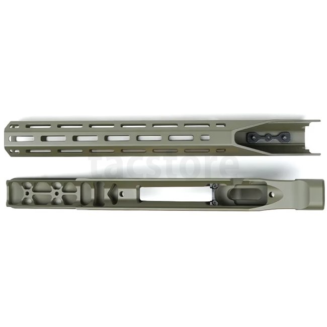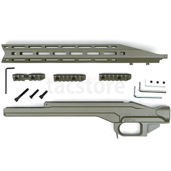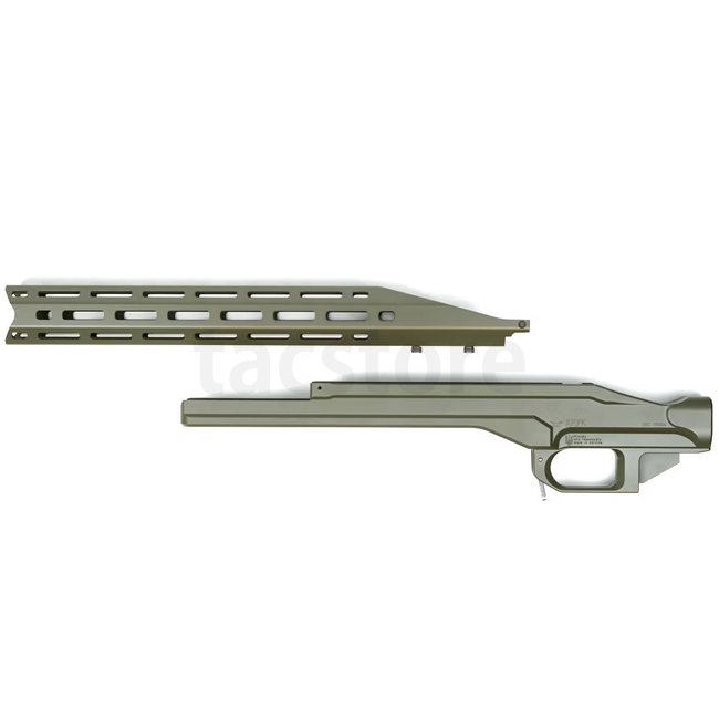 KRUK Aluminum Chassis & Handguard for Remington Model 700 Long Action - Olive. Precision system engineered for accuracy and modularity. Features rigid handguard, M-LOK interface, AR-style grip interface, AR buffer tube stock mount, AICS magazine well, V-s