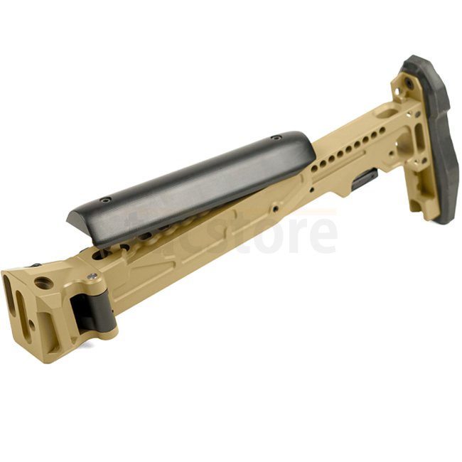 CRC 5002/9037L-MIL Left-Side Folding Telescopic Buttstock for AK (4.5mm); Weight: 525g; Length adjustment: 20cm to 27cm; Cheek riser: 4 positions, 2cm max elevation; Buttplate adjustment: ±3cm height range; Attachment points: Standard sling loops and QD b