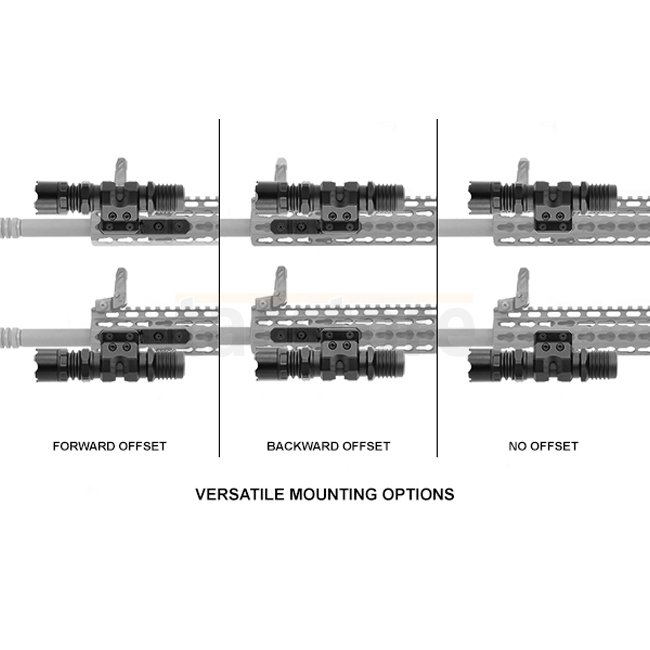 • Removable offset mount provides 46.5mm forward or backward offset in addition to the flashlight ring's 28.5mm vertical or downward offset