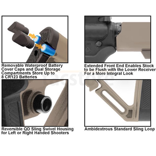 An ideal choice for your AR15 rifle, the Leapers Pro AR15 Ops Ready S1 Mil-Spec Stock in Dark Earth offers a lightweight design with a sealed storage compartment for 8x CR123 batteries. Perfectly suited for MilSpec Stock Tubes measuring 1.148 inches (2.91
