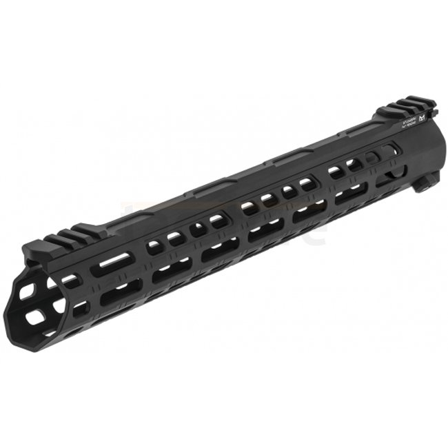Enhance your AR-15 with the Leapers Pro Forerunner 14 Inch M-LOK Free Float Handguard in sleek black. Compatible with M4/AR-15 and made of durable aluminum, this handguard comes with essential accessories for easy installation.