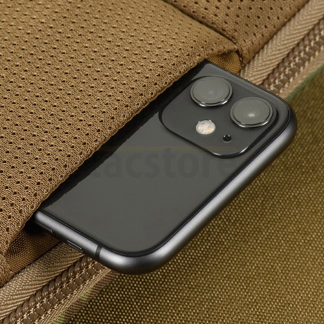 This model has two pockets and an adjustable shoulder strap with Fastex. The inner wall of the main compartment is made of velour, to which you can attach Velcro-based inserts. On the front there is a pocket closed with a waterproof zipper and a MOLLE system for attaching additional equipment. The back is equipped with a soft, shock-absorbing mesh with a suitable opening for a phone.