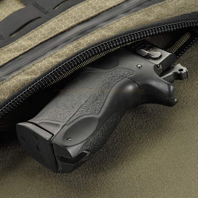This model has two pockets and an adjustable shoulder strap with Fastex. The inner wall of the main compartment is made of velour, to which you can attach Velcro-based inserts. On the front there is a pocket closed with a waterproof zipper and a MOLLE system for attaching additional equipment. The back is equipped with a soft, shock-absorbing mesh with a suitable opening for a phone.