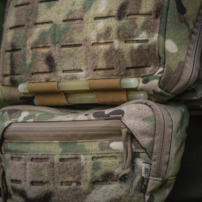The pouch has one large compartment. The inner walls of the pouch are lined with velor, which allows you to attach modular inserts or place a tablet. A Velcro panel is sewn on to the front, intended for attaching equipment and patches. At the bottom of the pouch, the designers added an elastic band for a chemical light. The Admin Large Elite attaches to you gear via the MOLLE interface.