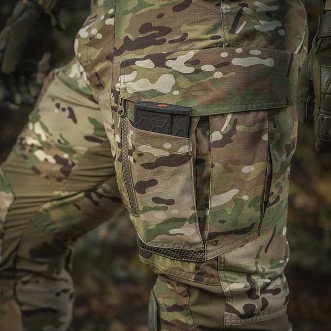The cargo pocket with an asymmetric flap is equipped with an additional patch pocket, which can fit an M4 or AK magazine. The cargo pocket itself is quite roomy. It has two folds, due to which its size can be increased for carrying bulky items. In addition, the cargo pocket is equipped with a second zippered entrance, which allows to access its contents from a sitting position. The bottom of the cargo pockets has a mesh for adimtional ventilation.