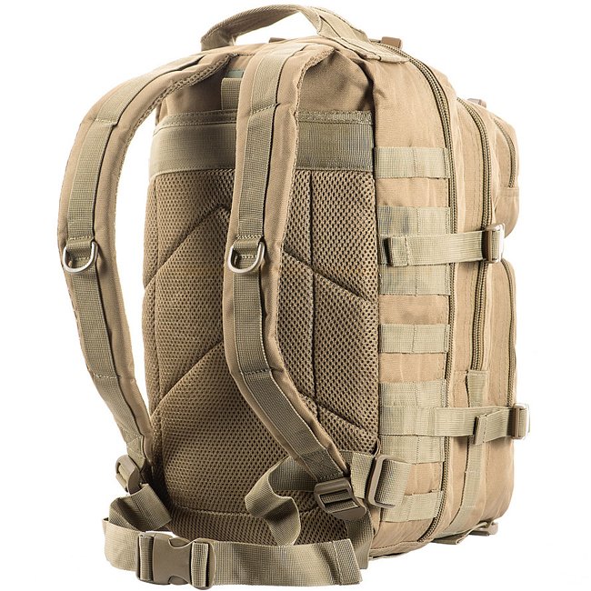 M-Tac Assault Pack Backpack - Tan: City-ready backpack with MOLLE system, 2 main compartments, extra zippered pockets, and padded straps. Material: 100% polyester. Volume: 20L. Weight: 1100g. Dimensions: 42x20x25cm.