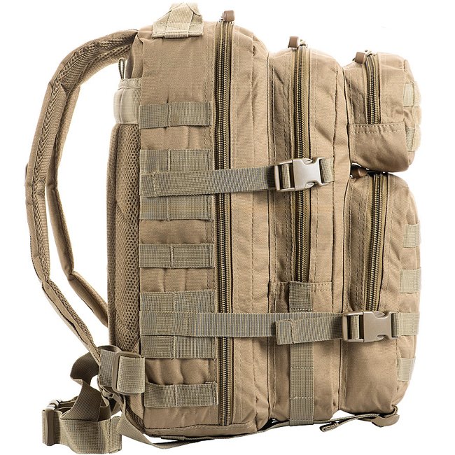 You can use the Assault Pack as a city backpack or for short hikes. Equipped with a MOLLE fastening system it has two large main zippered compartments. There are two additional zippered pockets on the front and straps for carrying the backpack with a soft padding.
