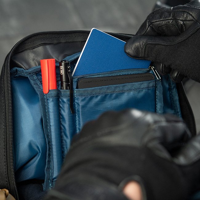 There are also dedicated pockets on the side for water bottles. Both regular plastic 1-liter bottles and Nalgene flasks will fit perfectly there.
