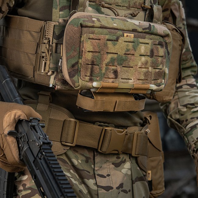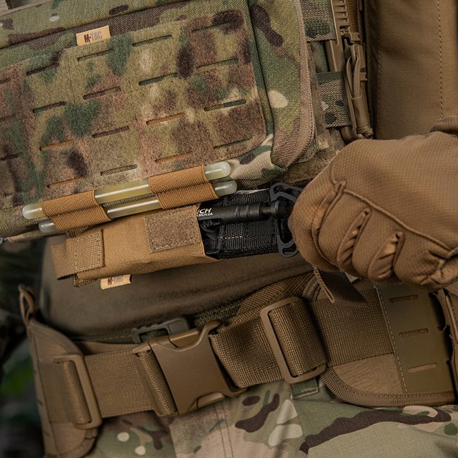 Attachment is by a wide elastic strap, which reliably fixes the tourniquet. The inner wall is made of a nylon strap, which allows you to easily remove the tourniquet from the pouch. Additional fixing elements are sewn from high-quality Cordura 500D material. Thanks to the well-thought-out design of the pouch, you can instantly remove the tourniquet and use it very quickly. This model attaches to gear using the Velcro interface.
