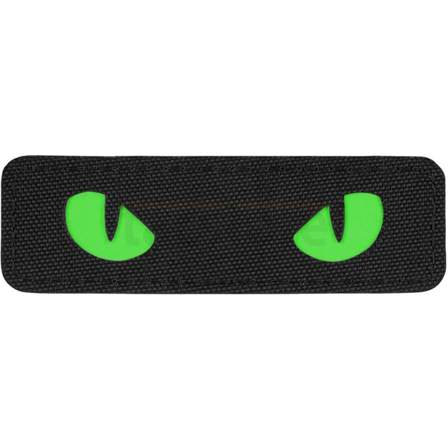 M-Tac Green Cat Eyes Laser Cut Patch featuring a black design. Made with Cordura 500D front material and hook surface back material. Dimensions: 80 x 25 mm.