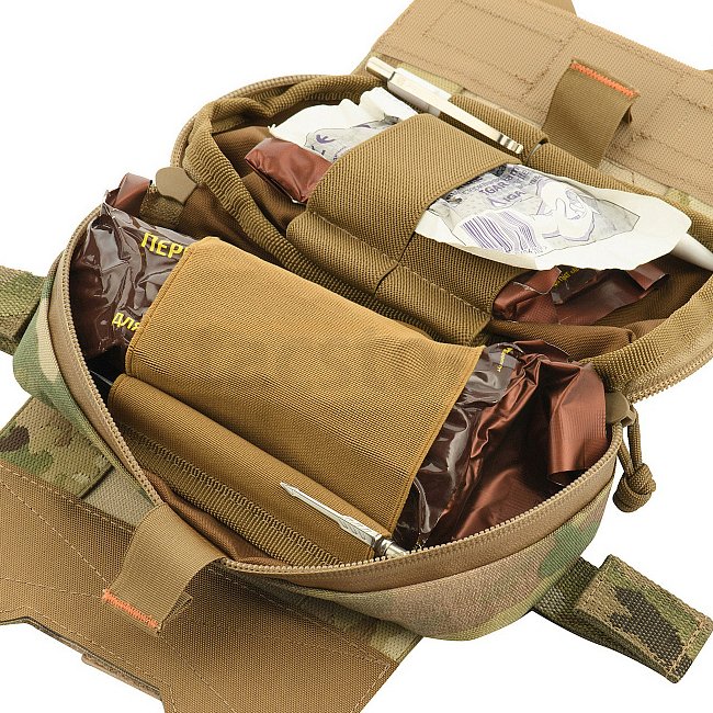 The organizer is made of Cordura 500D with a polyurethane backing using a YKK AquaGuard waterproof zipper to keep the content dry. it can be quickly removed from the base on either side. There is a thermal transfer sign on the front of the first aid kit to indicate its optimal position.