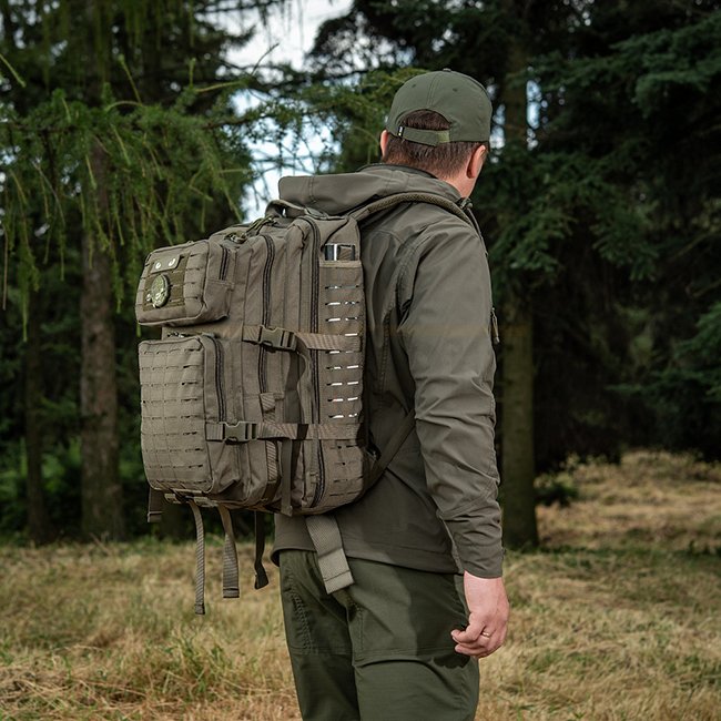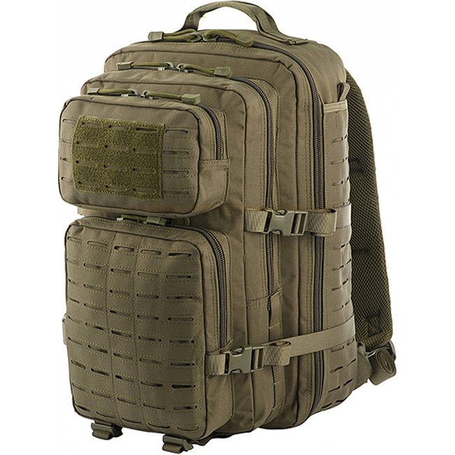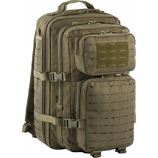 The M-Tac Large Assault Pack Backpack Laser Cut in Dark Olive is a spacious, lightweight, and versatile backpack perfect for urban use and short hikes. Featuring MOLLE system compatibility, two large main compartments, and two front zippered pockets. Adju