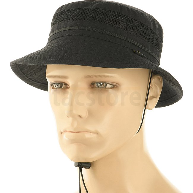 M-Tac Mesh Boonie Hat Elite Nyco - Black - 56. Legendary American Boonie hat model with semi-rigid brim, attachment ribbon, and wind gust cord. Made from durable American NYCO fabric for US military uniforms. Features mesh insert for ventilation. Ideal fo