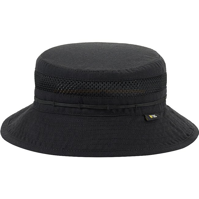 The M-Tac Mesh Boonie Hat Elite Nyco in Black - 57 has a semi-rigid brim, thin ribbon for camo materials, and wind gust cord. Made from durable US military grade NYCO fabric with mesh insert for ventilation.