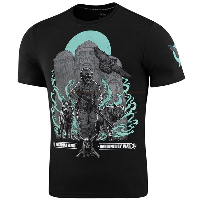 M-Tac Our Land T-Shirt in Black. Modern soldier print symbolizing courage & bravery of Armed Forces of Ukraine. Features owl & wolf, symbols of wisdom, loyalty, strength, & courage. Made of 93% cotton & 7% elastane for comfort and style. Weight: 190g.