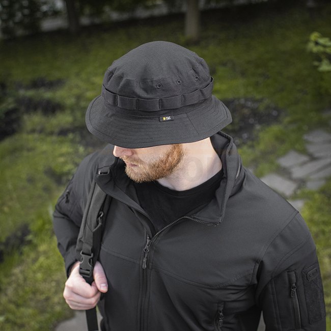 The M-Tac Panama Boonie Ripstop in Black, size 57, is a modern take on the classic American Boonie model. Featuring a semi-rigid brim, tape for attaching camouflage items, a chin cord for security, and built-in ventilation eyelets. Made of durable rip-sto
