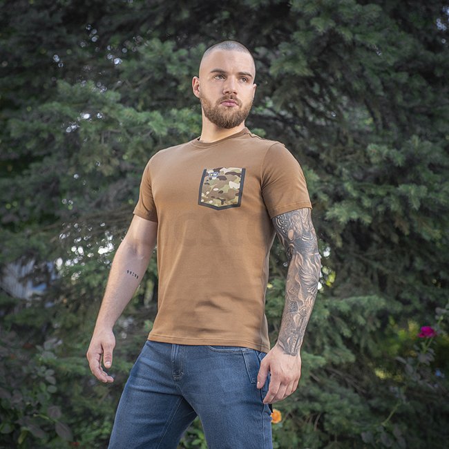 M-Tac Pocket T-Shirt 93/7 - Coyote - XL - Made of high-quality breathable fabric, optimized for body thermoregulation, with anatomic cut and thin elastic jersey. Features a small breast pocket for documents. Material: 93% cotton, 7% elastane.