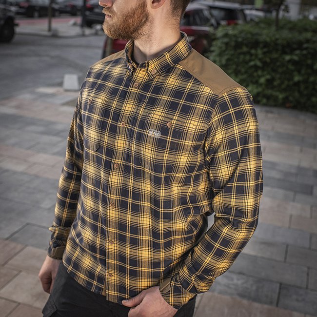 M-Tac Redneck Shirt - Navy Blue / Yellow - XL - Long. Versatile tactical plaid shirt, perfect for work or casual wear. US-manufactured wind and moisture-proof shoulder reinforcements. Classic look with adjustable Velcro cuffs. Must-have item for any wardr