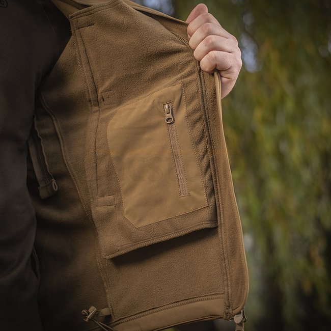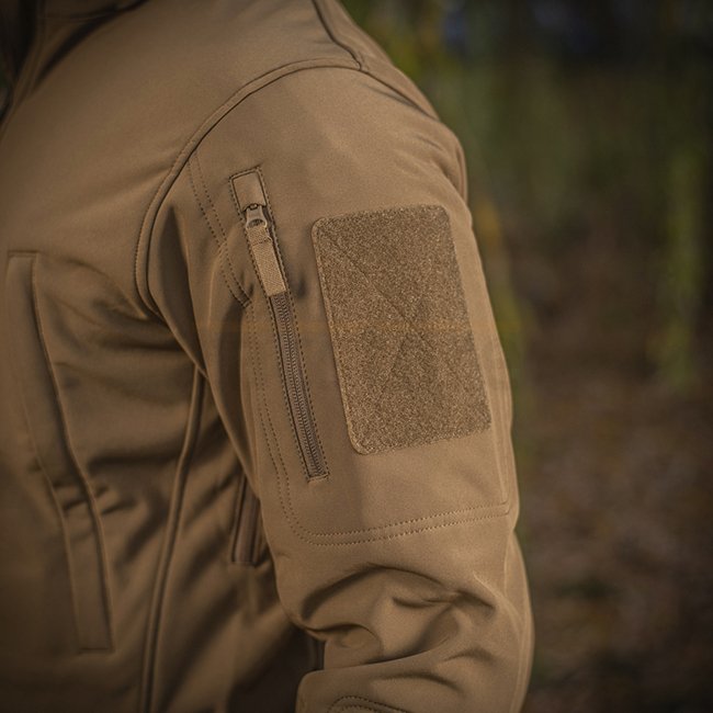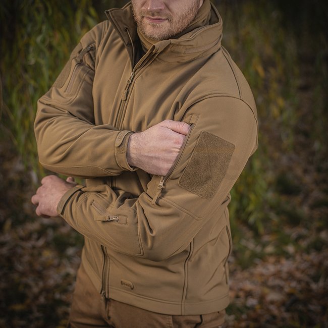 M-Tac Soft Shell Jacket - Tan - M - with interlayer polyurethane membrane for weather protection and thin fleece layer. Lightweight, dual-layer design provides wind & weather protection. Moisture-deflecting & dirt-deflecting top fabric. Comfortable and st