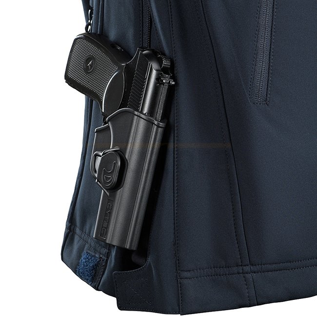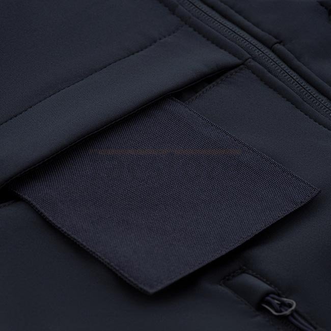 The Soft Shell Jacket is made of an interlayer polyurethane membrane that protects from bad weather. Inside, it has a thin fleece layer. It has two identification panels, which, depending on the situation, can be pulled out or remain hidden. The empty panels can be printed or emproided. A side opening system allows quick access to a side arm.