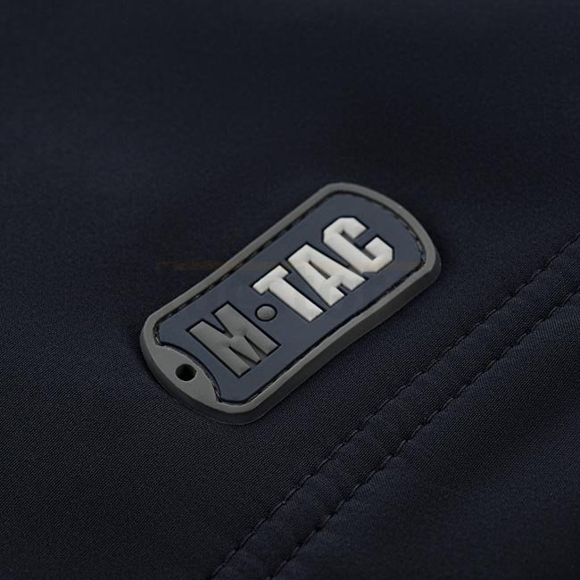 The M-Tac Soft Shell Police Jacket in Navy Blue size L provides protection from bad weather with an interlayer polyurethane membrane and a thin fleece layer. Features identification panels for customization and quick access to a side arm. Lightweight, wit