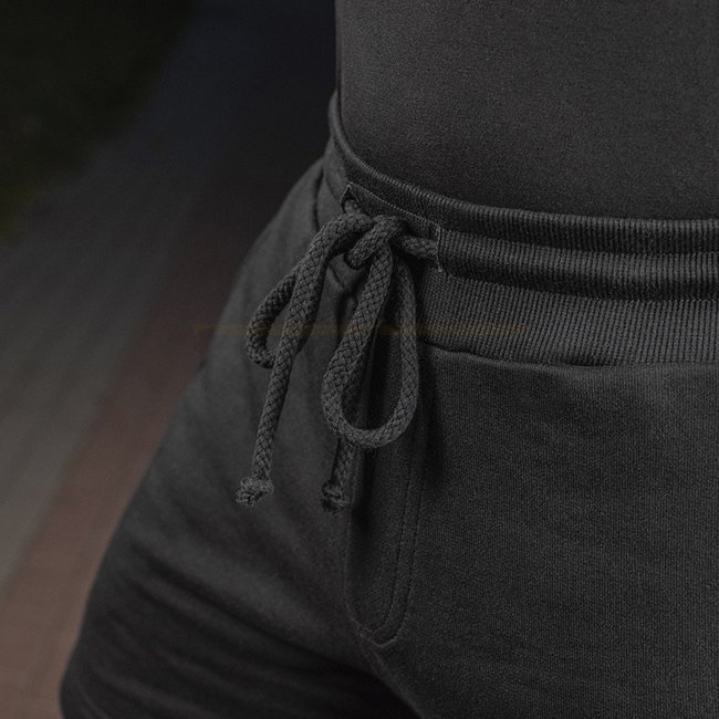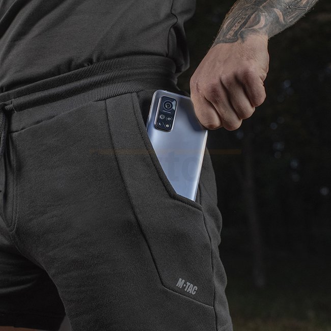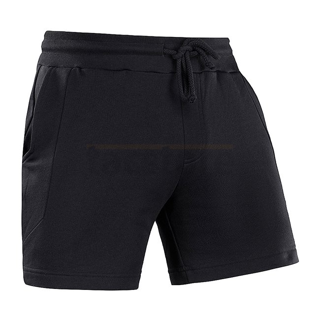 Comfortable Sport Fit Cotton Shorts in black color. Made from 100% cotton, ensuring sweat-free comfort. Features elastic band for secure fit, two side pockets with stylish shape, and brand logo on the left pocket. Ideal for sports and daily wear in hot we