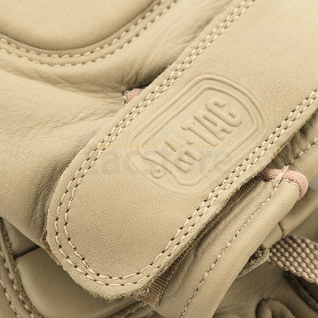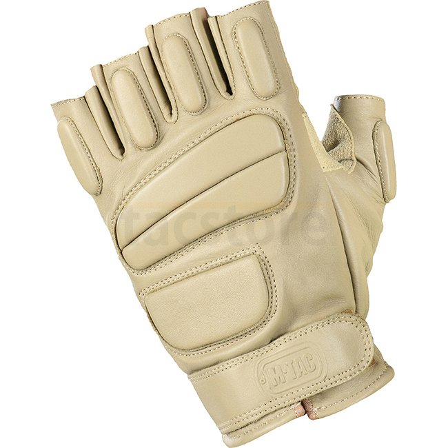 M-Tac Tactical Assault Gloves Fingerless Mk.1 in Khaki XL. Designed for handling weapons, reinforced palm pad made of genuine leather, cushioning pads over knuckles, Velcro fastener. Material: Polyester/leather.