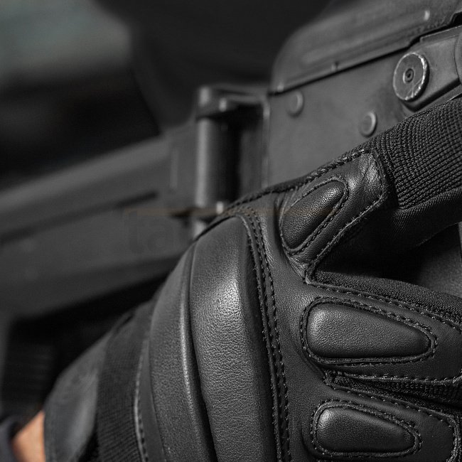 M-Tac Tactical Assault Gloves Mk.2 - Black - XL are designed for weapon handling, with reinforced palm pad made of genuine leather to prevent injuries. Features cushioning pads over knuckles and Velcro fastener on cuff. Material: Polyester/leather