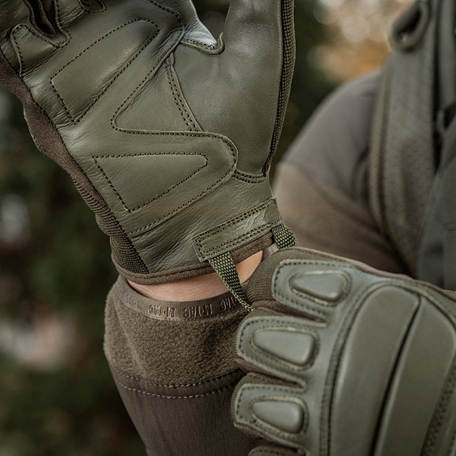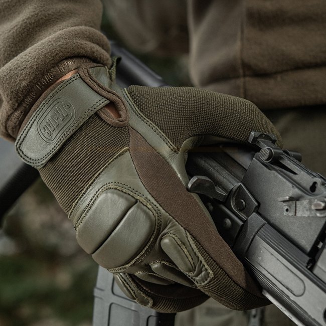 M-Tac Tactical Assault Gloves Mk.2 in Olive color, designed for handling weapons. Reinforced palm pad made of genuine leather, cushioning pads over knuckles, and Velcro fastener cuff. Material: Polyester / leather.