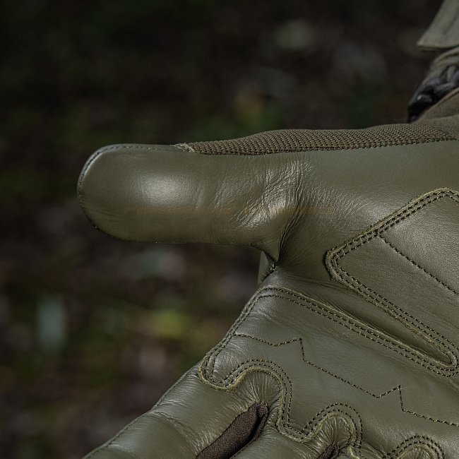 The M-Tac Tactical Assault Gloves Mk.4 - Olive - S are designed for handling weapons. They have a reinforced palm pad made of genuine leather for injury prevention and grip, cushioning pads over the knuckles, and a Velcro fastener cuff closure. Material: