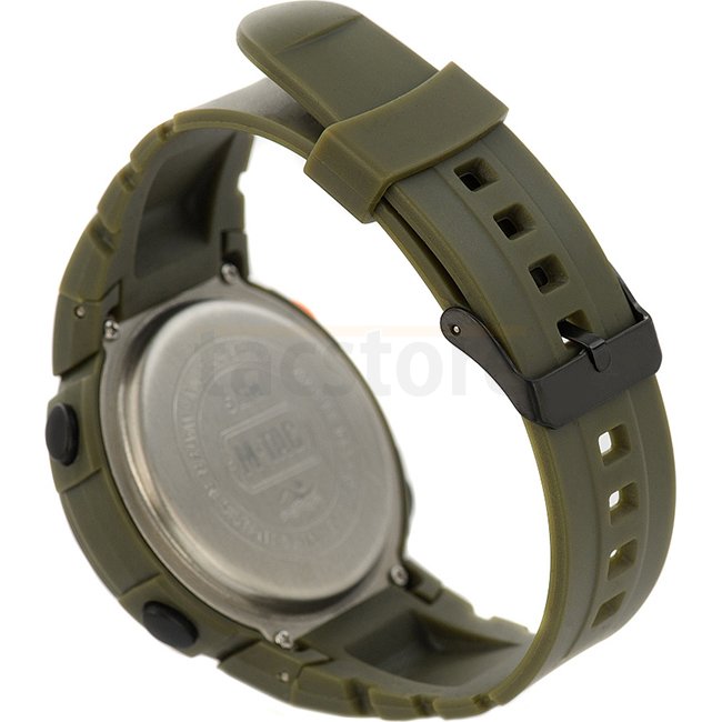 M-Tac Tactical Compass Watch - Olive - perfect for outdoor enthusiasts! Equipped with a compass, stopwatch, and multiple alarms, this waterproof watch ensures you never get lost on your adventures. Comfortable plastic strap for all-day wear.