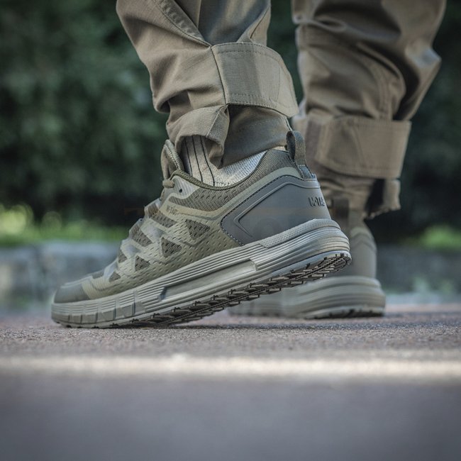 M-Tac Tactical Summer Sport Sneakers in Army Olive color, size 37. Improved model for everyday use in hot weather. Made of breathable, wear-resistant synthetic materials with sealed pads to prevent sand and dust from passing through. Rubberized toe and he