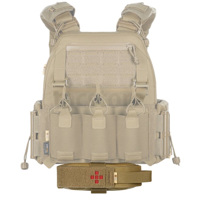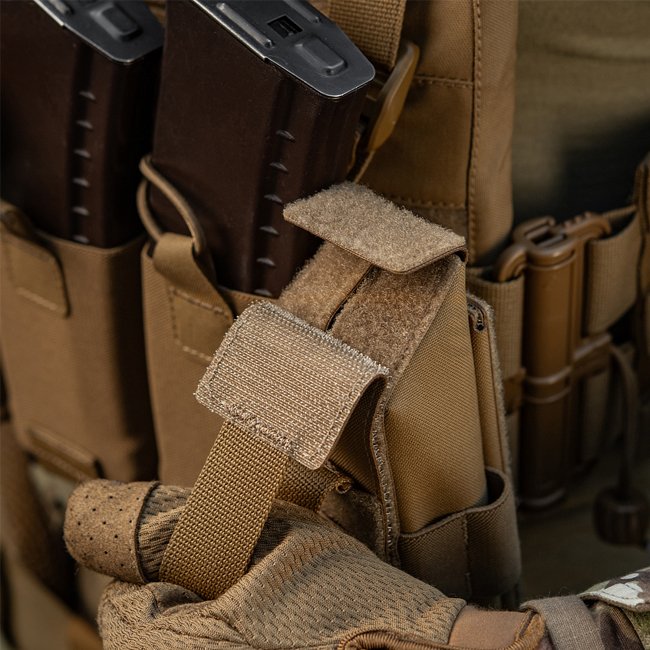 There are two tabs with Velcro fasteners on the back of the pouch. You can use them to attach the pouch to the bottom of a plate carrier or to its right or left side. To do this, remove the modular insert from the plate carrier, attach the pouch using the Velcro fasteners on the bottom and return the modular insert to its original position.