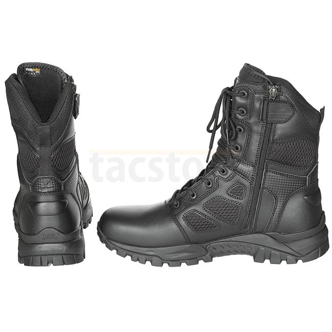 Lightweight and breathable Magnum Combat Boots Elite Spider X 8.0 in Black, size 47. Features Cordura AFT 3D air mesh vents, Spidermesh lining, padded shaft, Recoil midsole, Vibram outsole, YKK sidezips, rustproof eyelets. Non-metallic, scan-safe. EN ISO